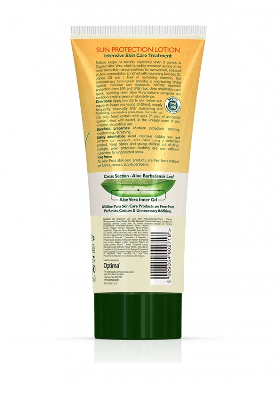 Aloe Pura BIO Aloe Vera gel opalovací mléko SPF15 - je vyrobeno ze 100% čistého Aloe Vera gelu, obsahujícího maximum živin rostliny Aloe Vera Barbadensis. Speciální Sun Protection Lotion SPF15 s jojobovým olejem, avokádem a heřmánkem vám poskytuje 15 krát delší přirozenou ochranu před UVB zářením.