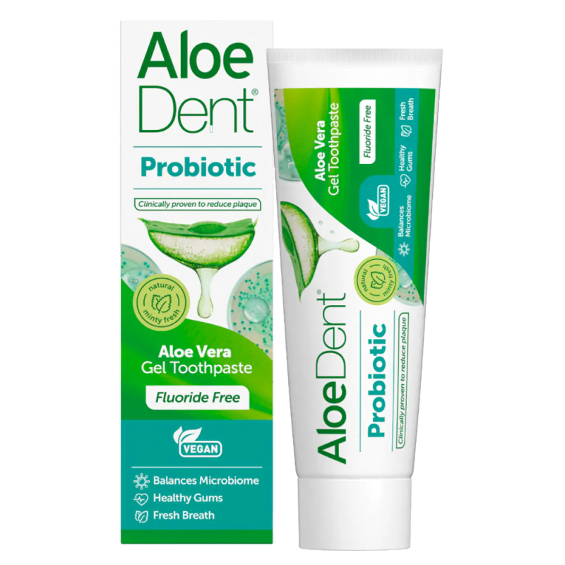 AloeDent Probiotic Toothpaste je pečlivě vyvinutá zubní pasta, která kombinuje sílu probiotického komplexu a Aloe Vera. Pomáhá bojovat proti zápachu z úst, tvorbě zubního plaku a podporuje růst prospěšných bakterií v ústech.