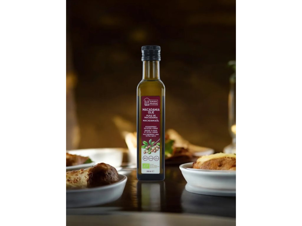 Amanprana BIO Macadamia Oil 250 ml – vzácný, lisovaný za studena makadamiový olej s jemnou máslovou chutí a oříškovou vůní, plný omega-7 a mononenasycených mastných kyselin a vysokým kouřovým bodem.