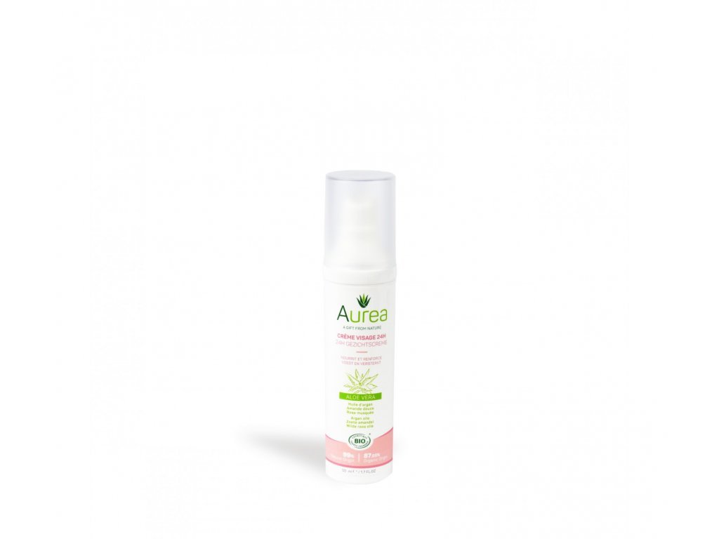 Aurea BIO 24H krém s Aloe Vera hydratuje, vyživuje a posiluje pokožku obličeje. Obsahuje organické oleje z arganu, mandlí, avokáda, šípku, pupalky a meruňkových jader a je vhodný pro všechny typy pleti.