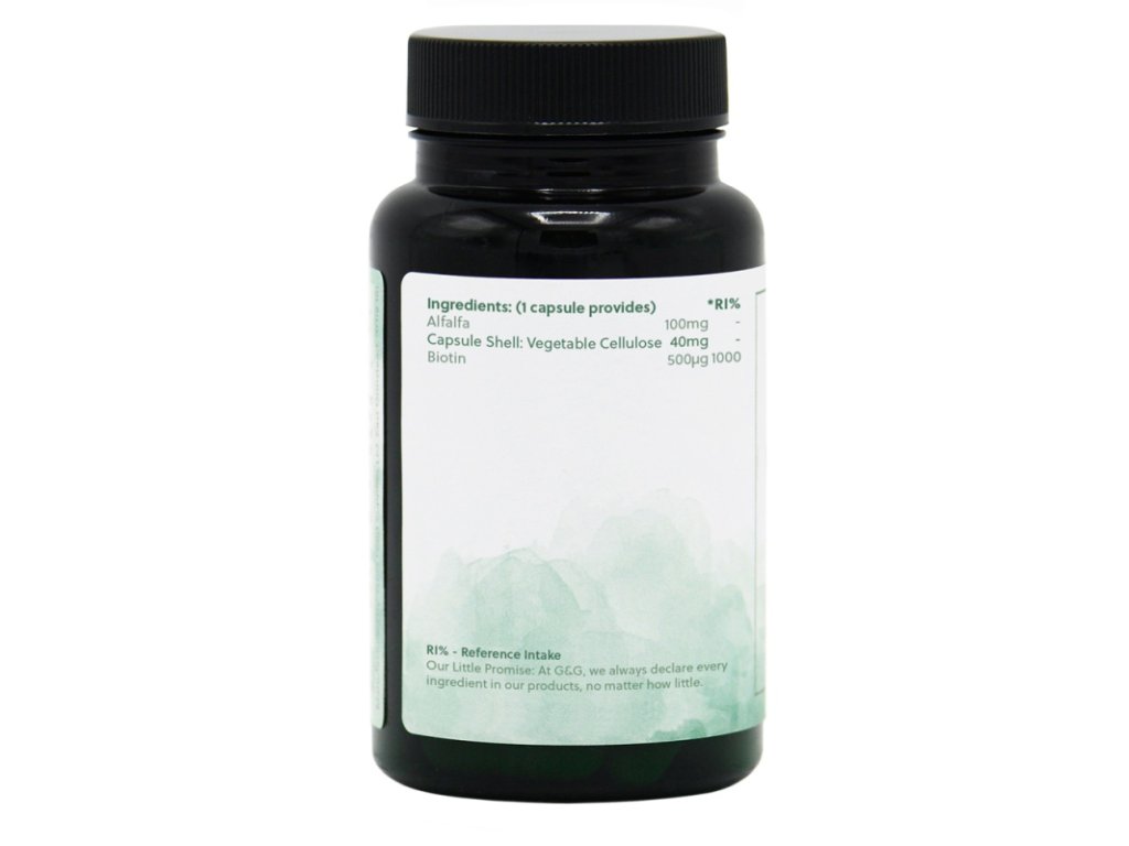 Биотинът, известен още като витамин H, помага за правилната метаболитна функция и поддържа здрава кожа, коса и нокти. Люцерната съдържа редица хранителни вещества като витамини, минерали и микроелементи, които могат да помогнат за поддържане на цялостното здраве. Добавянето на люцерна към вашата добавка повишава ефективността на биотина и насърчава неговото усвояване. Люцерната е богата на много полезни вещества, като витамини, минерали, хлорофил и антиоксиданти, които могат да работят синергично с биотина.