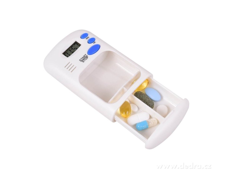 Практична аптечка с цифрова аларма и две отделения за лекарства. Лесно настройване на напомняне за дозировка директно на дисплея. Батериите са включени.