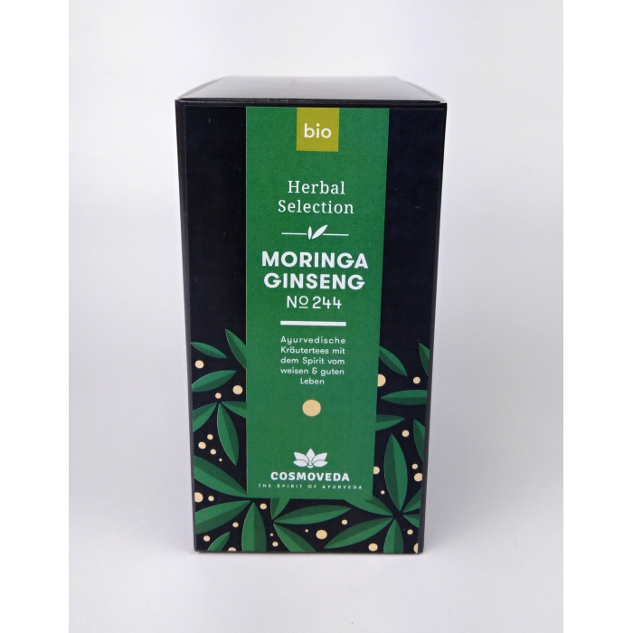 Bylinný čaj s obsahem moringy a ženšenu. S chutí čaje Vás bude provázet dokonalá harmonie požitku a pohody, inspirovaná duchem Ajurvédy. Pro nesrovnatelný zážitek z čisté chuti jsou bylinky hrubší, bez příchuti a jsou baleny do přírodního čajového sáčku s velkými póry. Pro ochranu životního prostředí nepoužíváme nitě ani papírové štítky a čajové sáčky jsou vyrobeny z kukuřičného škrobu.