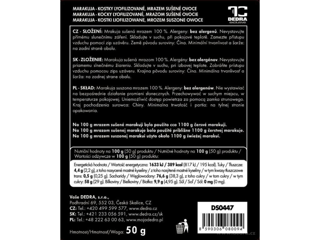 Für 100 g gefriergetrocknete Passionsfrüchte wurden ca. 1100 g frische Passionsfrüchte verwendet.