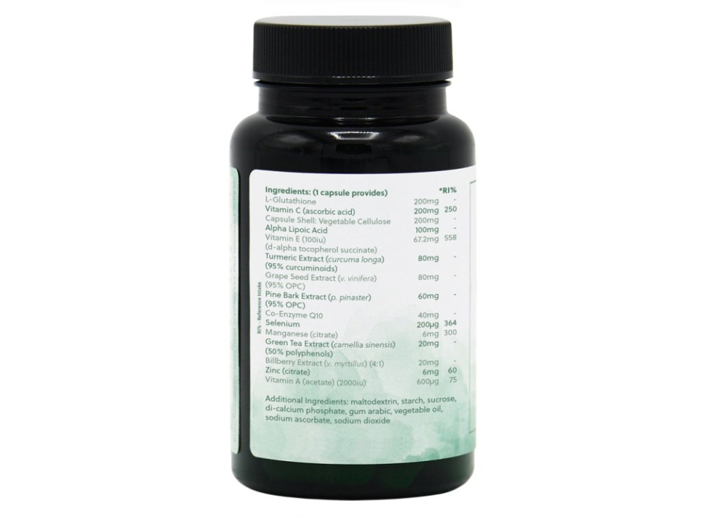 - Hochwirksames Coenzym Q10, Vitamin C und Glutathion.