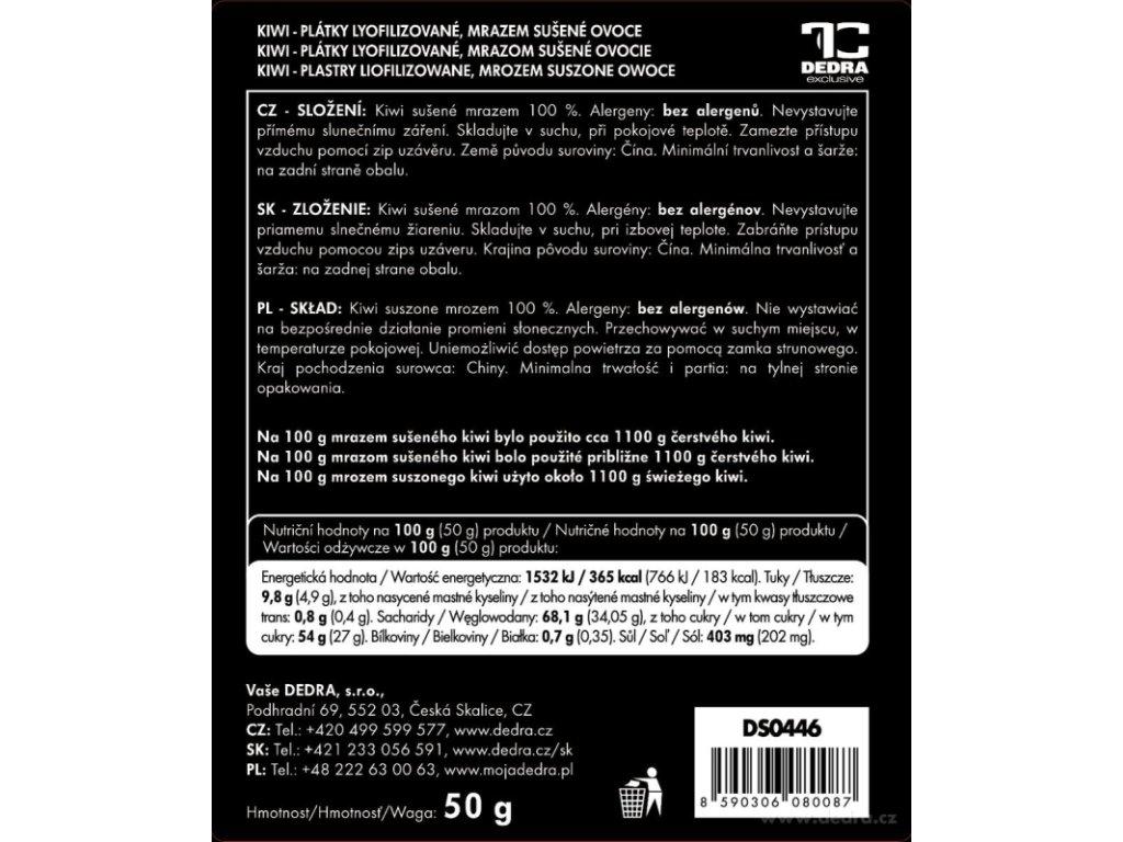 Für 100 g gefriergetrocknete Kiwis wurden ca. 1100 g frische Kiwis verwendet.