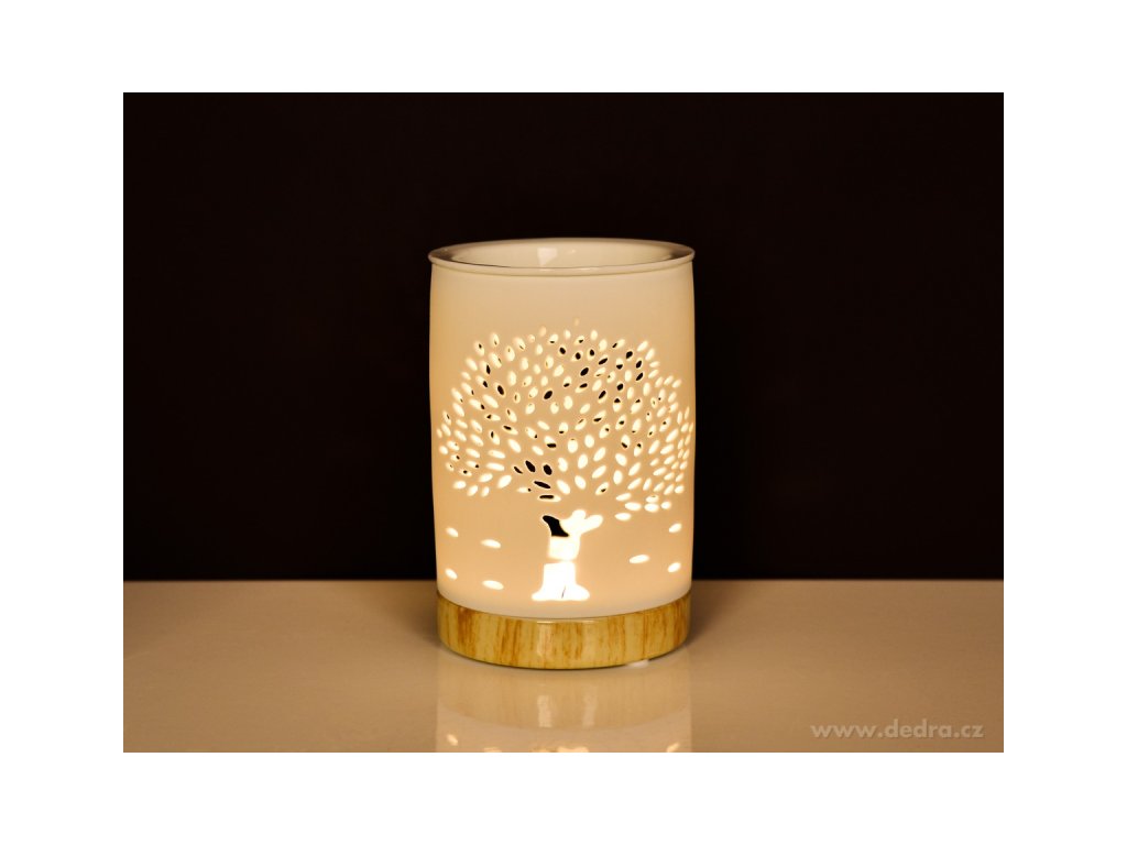 XXL-Duftlampe aus Keramik mit tiefer Schale, matter Glasur und Baumdekor. Durchmesser 9,5 cm, Höhe 14,5 cm. Dank der Löcher im Baumdekor entstehen wunderschöne Lichteffekte.