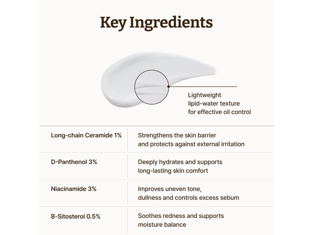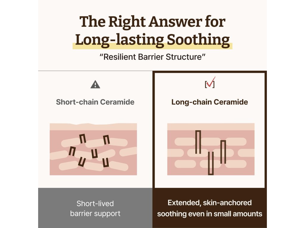 Kombinace dlouhořetězcového ceramidu, panthenolu, niacinamidu a beta-sitosterolu podporuje kožní bariéru, dodává hydrataci, zklidňuje citlivost a zvyšuje odolnost pleti pro hladší a zdravější vzhled.