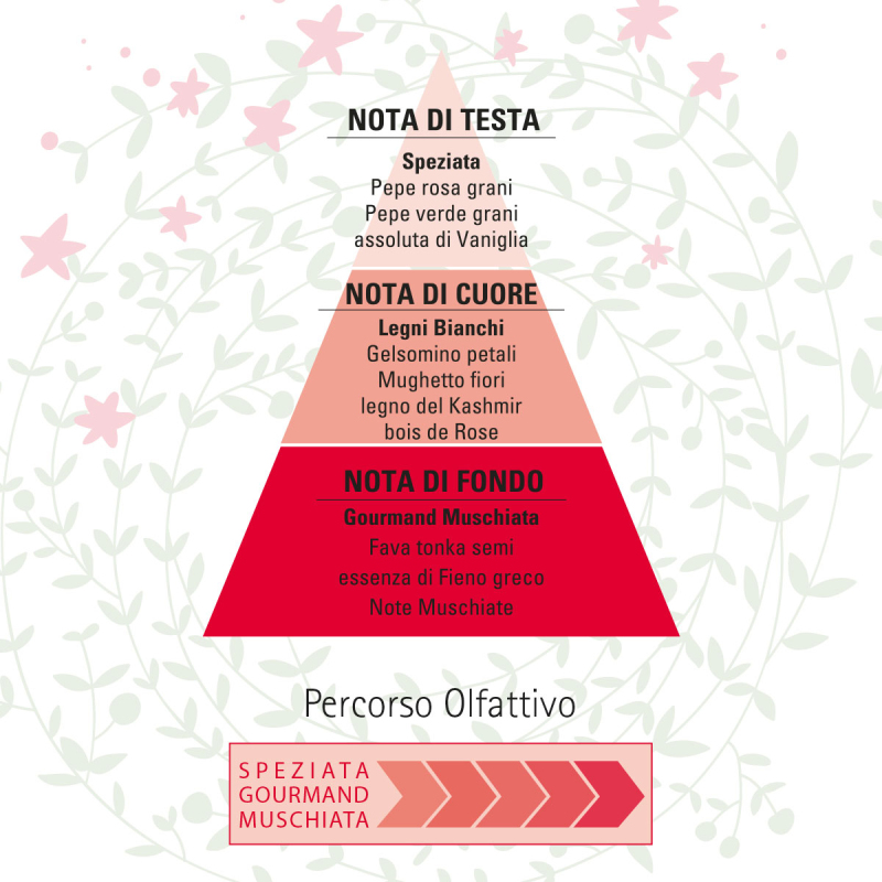 Vůně začíná intenzivními a aromatickými vrchními tóny růžového pepře z Madagaskaru, doplněnými živými tóny zeleného pepře a podtrženými smyslnou vanilkou s lehce pudrovým nádechem. Srdce vůně zdůrazňuje ženskost kombinací okvětních lístků jasmínu a konvalinky, zatímco teplé dřevo kašmíru a růžového dřeva (Bois de Rose) dodává intenzitu a obklopující hloubku. Závěrečné tóny dotvářejí gurmánské akcenty tonka fazolí a pískavice, které vůni zaoblují a doznívají s jemnými pižmovými akordy.