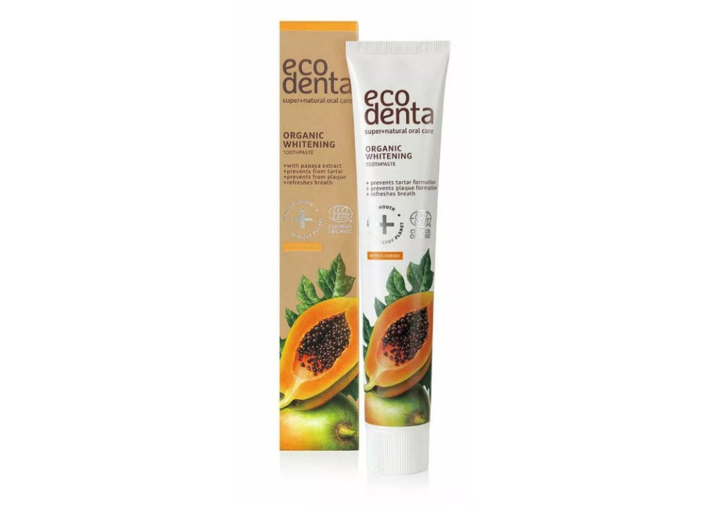 This whitening toothpaste from Ecodenta contains natural papaya extract - made from fermented papaya fruit - which has a whitening effect without damaging sensitive tooth enamel. Although this toothpaste also contains Mentha Piperita, or peppermint essential oil, this whitening toothpaste has a fruity taste thanks to the papaya extract.
