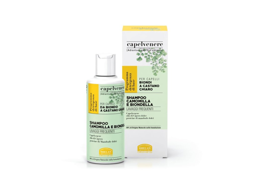 Helan Shampoo with chamomile and yarrow is designed for blonde and light chestnut hair, whether natural, dyed or highlighted. The combination of chamomile flower extract and yarrow inflorescences gives the hair a lightening effect that enhances shine and golden hues. Sweet almond proteins support hair strengthening and increase its softness and smoothness.