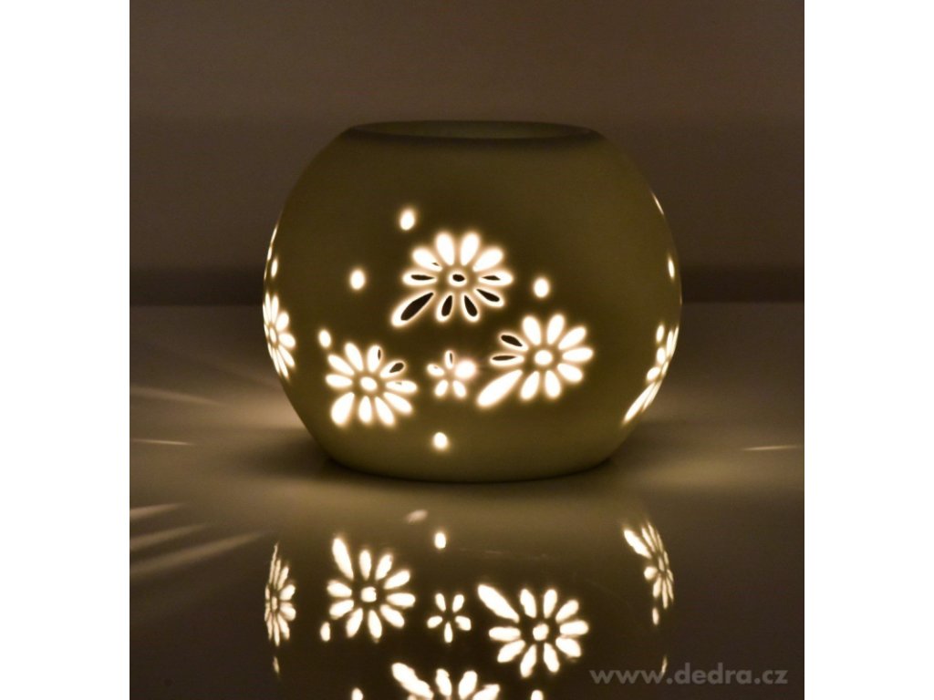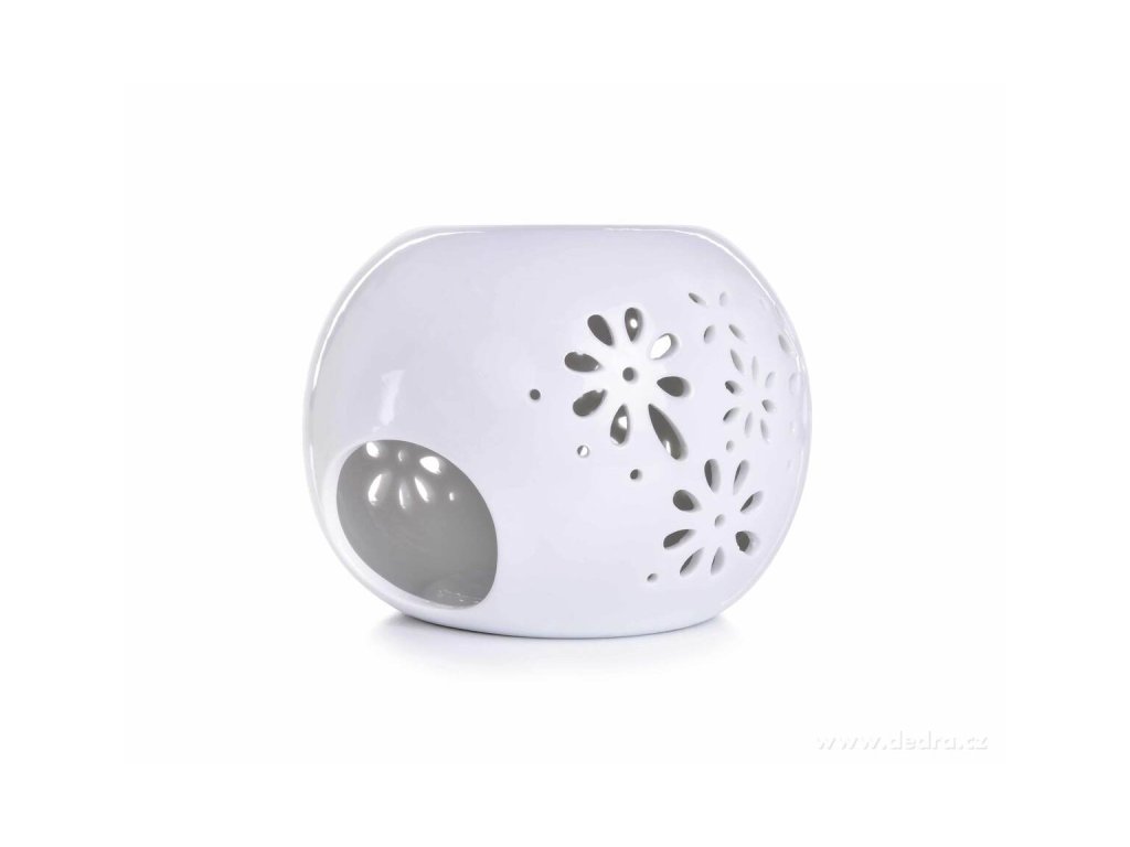Ceramic aroma lamp for tealights with lace decor. With a glossy glaze in white. Creates beautiful lighting effects. Simple yet elegant style fits into any interior.