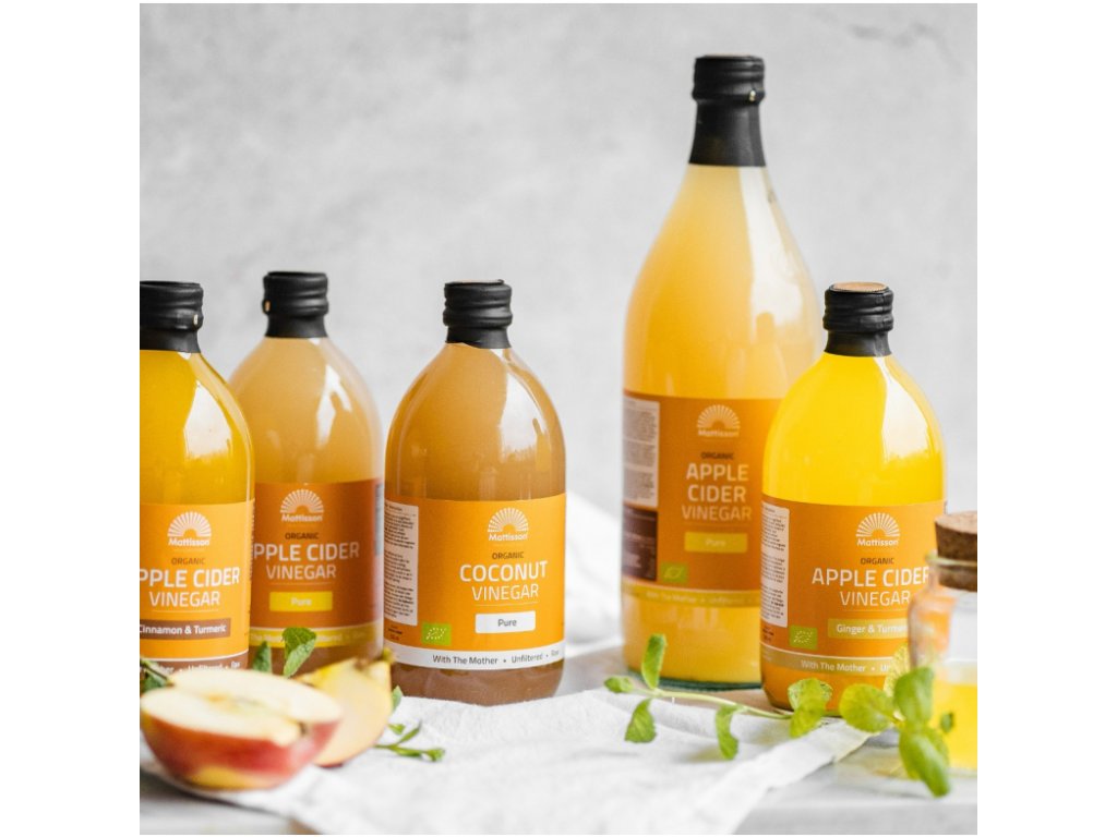 Apple cider vinegar (apple cider vinegar) is a golden yellow substance that is produced by fermenting apples. When apples are fermented, the sweeteners are converted into alcohol, which is then converted into apple cider vinegar by acetic acid bacteria. Mattisson apple cider vinegar is made from organically grown apples.