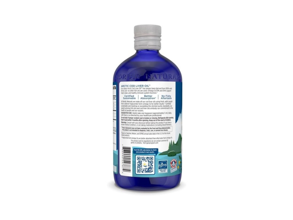 Nordic Naturals Arctic Cod Liver Oil is a premium 100% wild-caught Arctic cod liver oil. It contains 1060 mg of omega-3 (EPA + DHA) in a natural triglyceride form for superior absorption. It supports heart, brain, nervous system, immunity and overall vitality - with a clean orange taste and no fishy aftertaste.