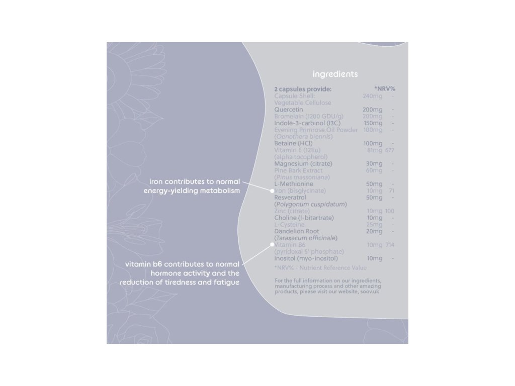 SOOV Endo is a targeted multivitamin designed to support hormonal activity and overall well-being throughout the menstrual cycle. It contains a synergistic blend of nutrients including indole-3-carbinol, evening primrose extract, quercetin, bromelain, resveratrol and other substances known for their positive effects on hormonal balance and inflammatory processes in the body. Vitamin B6 helps regulate hormonal activity and contributes to the reduction of tiredness and fatigue. SOOV Endo is the ideal choice for women looking for a natural way to harmonize their cycle, improve well-being and support detoxification.,