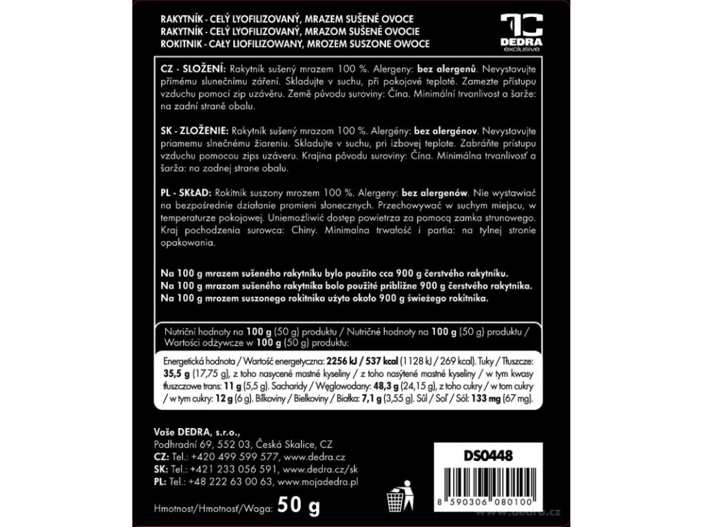 Ingredients: 100% freeze-dried sea buckthorn. Free of allergens. Do not expose to direct sunlight. Store in a dry place, at room temperature. Prevent air from entering using a zip lock.