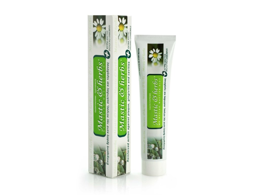 Toothpaste with extra mastic oil and organic chamomile.