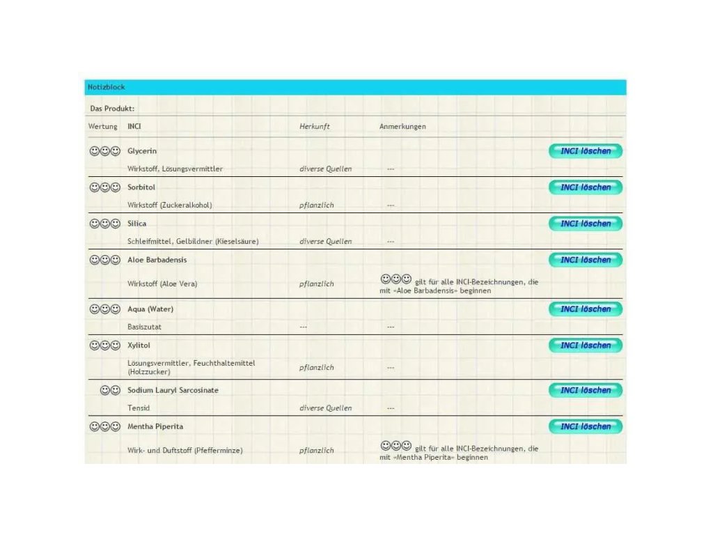 INCI: Glicerina, Sorbitol, Sílice Hidratada, Aloe Barbadensis, Agua, Xilitol, Lauroil Sarcosinato de Sodio, Aceite de Mentha Piperita, Carboximetil quitosano, Escina, Hidroxietilcelulosa, Mentol, Hidroximetilglicinato de Sodio, Ubiquinona, Aceite de Melaleuca Alternifolia, Ácido Cítrico, CI75810.