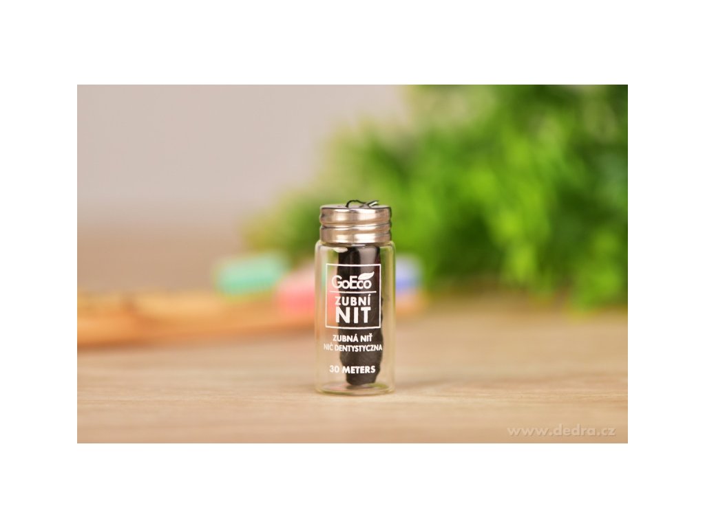 Hilo dental de 30 m: hecho de fibra de bambú con carbón de bambú y un sutil toque de mentol. Se presenta en una botella de vidrio con tapón metálico y cuchilla integrada para cortar fácilmente a la longitud deseada.