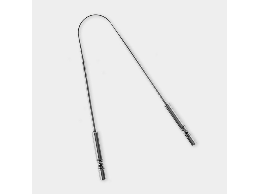 Instrucciones: Sujete los extremos del raspador con ambas manos. Limpie suavemente la superficie de la lengua desde la raíz hasta la punta con el extremo redondeado. Repita el proceso al menos cinco veces por la mañana en ayunas, antes de beber y cepillarse los dientes.