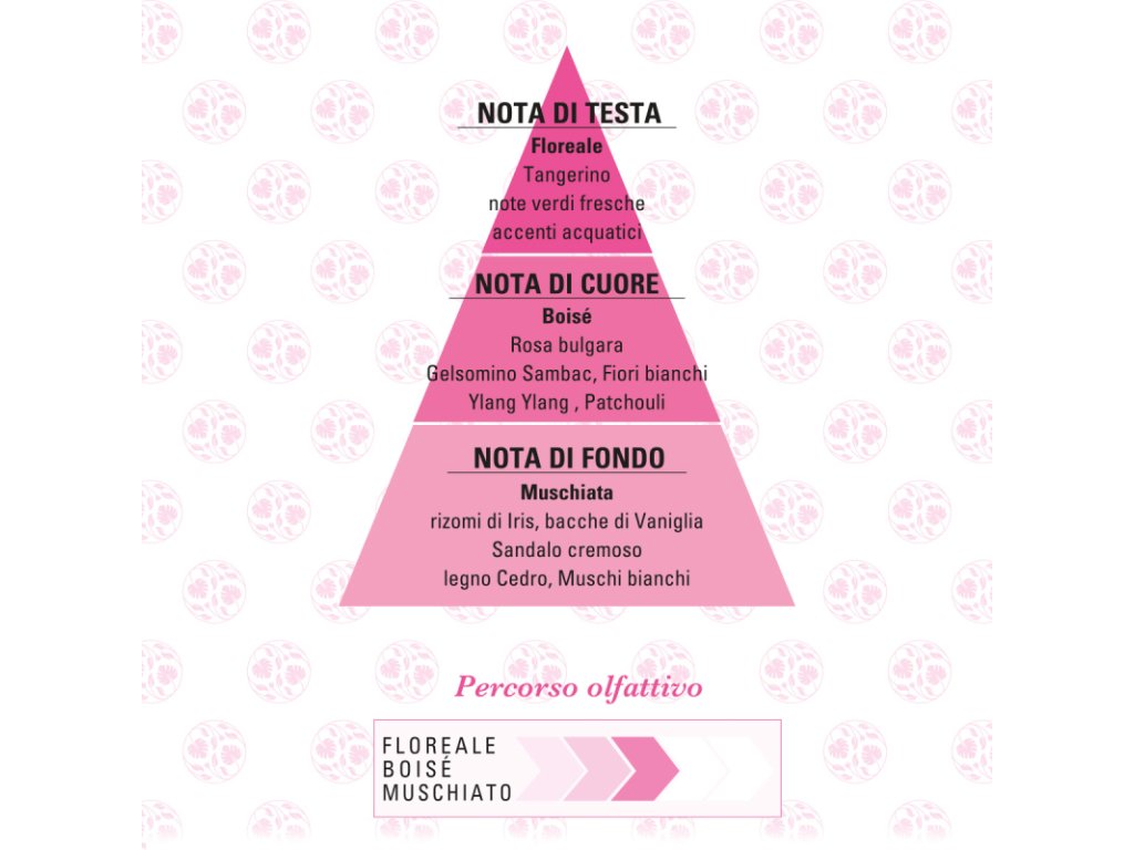 Tato vůně ztělesňuje podstatu emancipace a bourá předsudky. Začíná svěží směsí šťavnaté mandarinky a zelených tónů, které plynule přecházejí do moderního srdce s bulharskou růží, jasmínem a bílými květy, rozvíjejícími se v čistotě a harmonii. Základ vůně nabízí hloubku kosatce, sladkost vanilky a krémové tóny santalového dřeva, které přidávají kompozici příjemné teplo. Závěrečné tóny pačuli, jemně prolnuté bílým pižmem, zanechávají výraznou dřevitou stopu.