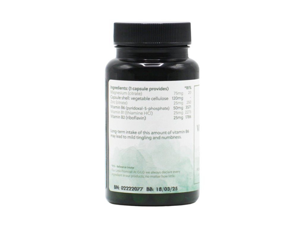 Notre complexe de vitamine B6 utilise la forme pyridoxal-5-phosphate (P5P) de la vitamine B6. Nous avons associé cette forme biologiquement active de vitamine B6 à du magnésium, du zinc et des vitamines B1 et B2, cofacteurs essentiels à son utilisation optimale. Ingrédients : 1 capsule apporte : % des VNR Magnésium (citrate) 75 mg (20 %) Enveloppe de la capsule : cellulose végétale 120 mg Zinc (citrate) 25 mg (250 %) Vitamine B6 (pyridoxal-5-phosphate) 50 mg (3,571 %) Vitamine B1 (chlorhydrate de thiamine) 25 mg (2,273 %) Vitamine B2 (riboflavine) 25 mg 1,786 % Complément alimentaire convenant aux végétariens et aux végétaliens. Certifié casher. Sans gluten, lactose, soja, sucre, conservateurs ni colorants artificiels. Posologie recommandée : Prendre 1 gélule par jour avec un repas ou selon les recommandations d’un professionnel de santé. Avertissement : Ne convient pas aux enfants, aux femmes enceintes ou allaitantes. Tenir hors de portée des enfants ! Ne pas utiliser comme substitut d’une alimentation variée et équilibrée. Ne pas dépasser la dose recommandée. Quantité : 30 capsules Fabricant : G&G Food Supplies LTD, East Grinstead, Sussex, RH19 1RL, Royaume-Uni. Conservation : à conserver dans un endroit sec et à l’abri de la lumière, à une température comprise entre 15 et 30 °C. Durée de conservation minimale : jusqu’à fin (voir emballage). Distributeur : Vitamins Cosmetics s.r.o., Krakovská 22, Prague 1, 11000. Tél. : +383 296 230 202, www.001shop.cz, www.gandgvitamins.cz.