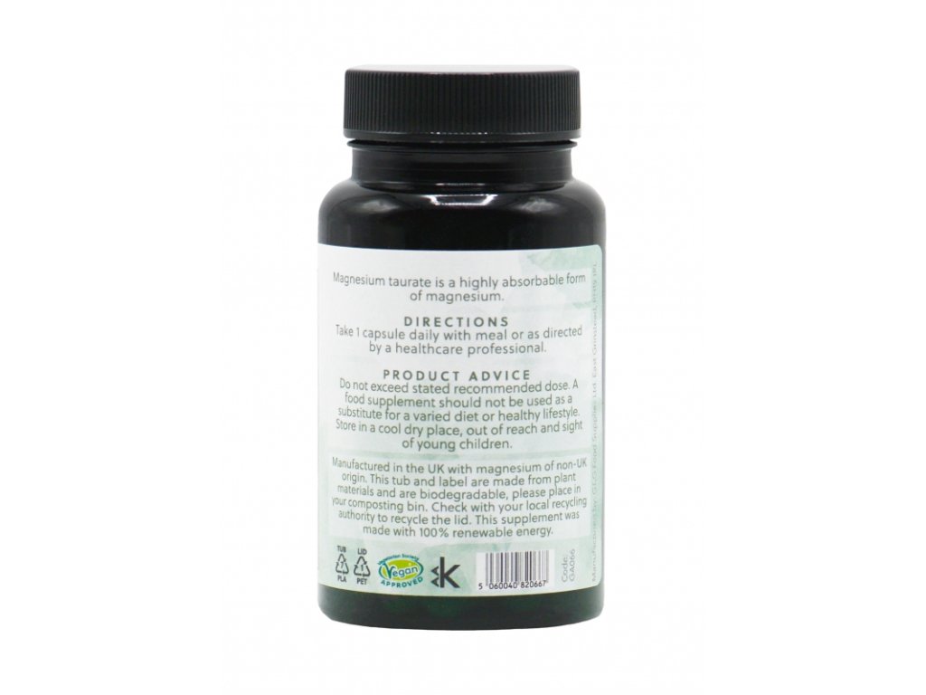 Náš doplněk Magnesium (taurát) poskytuje 50 mg elementárního taurátu hořečnatého ve veganské kapsli. V našem doplňku jsme použili taurát hořečnatý. Magnesium taurate je hořčíkový přípravek vytvořený s použitím aminokyseliny taurinu, která se v těle snadno vstřebává.