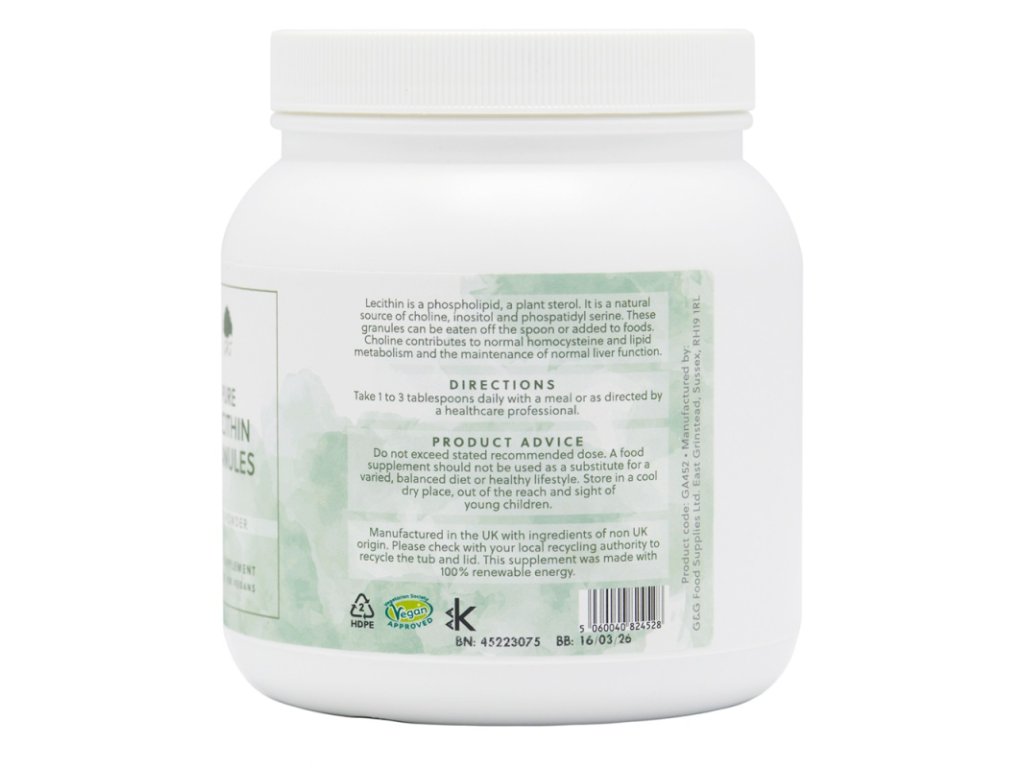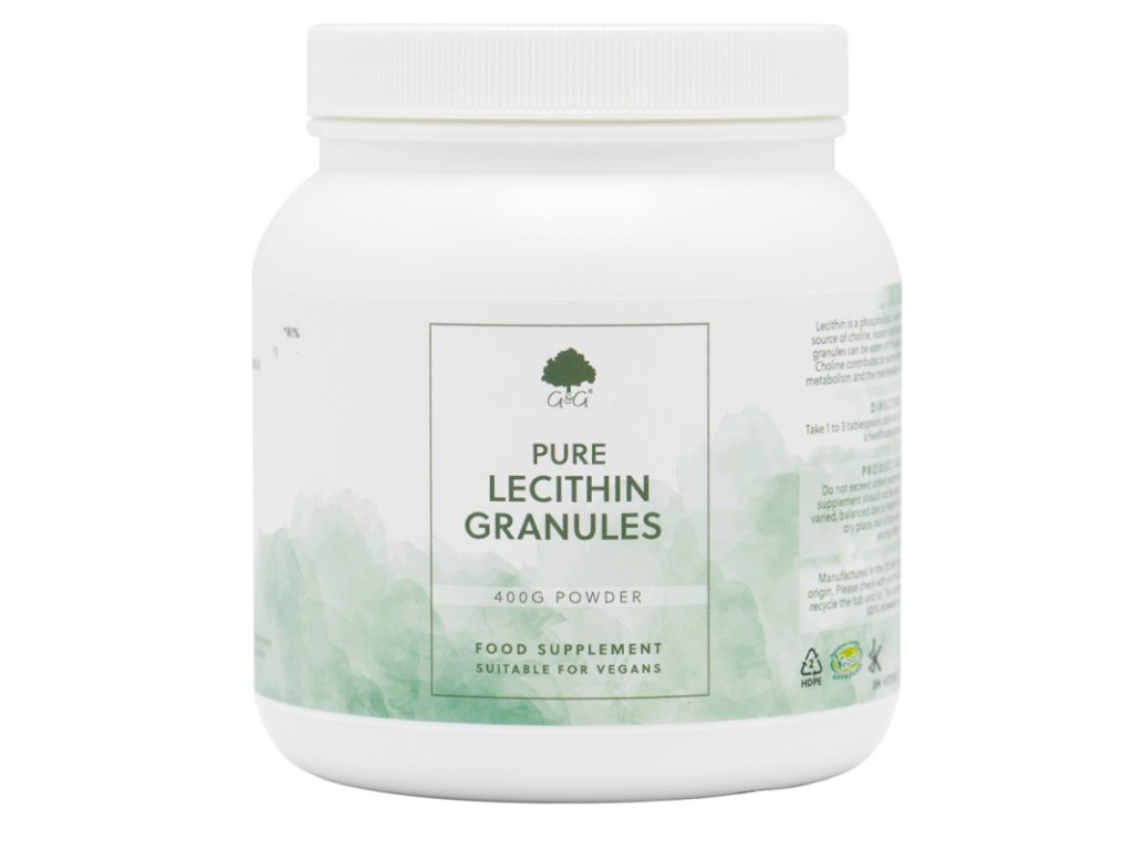 Lecitinové granule od renomované britské firmy G&G Vitamins jsou vyrobeny ze 100% čistého geneticky nemodifikovaného sójového lecitinu. Granule lze užívat ze lžičky nebo je přidávat do potravin jako zahušťovací metodu, např. do polévek a dresinků.