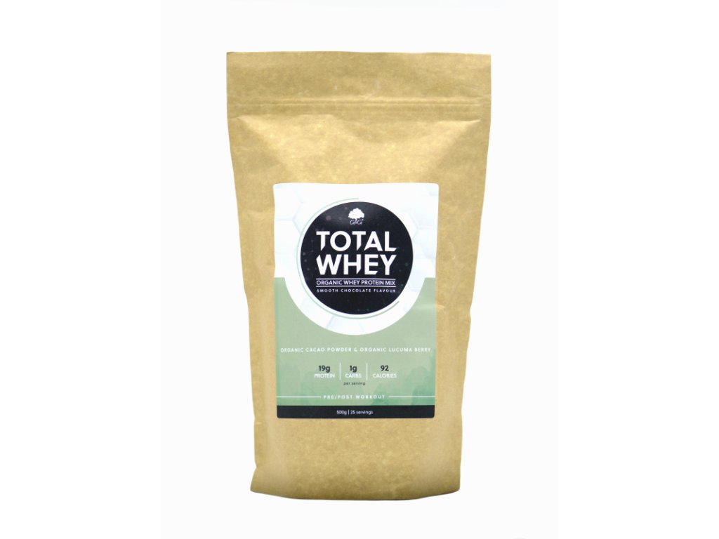 Total Whey je organický, vyrobený ze 100% přírodních surovin. Syrovátkový protein pochází od krav, které se volně pohybují na ekologických, neznečištěných pastvinách. Jedinými dalšími složkami jsou lucuma a kakao, které dodávají jemnou čokoládovou chuť.