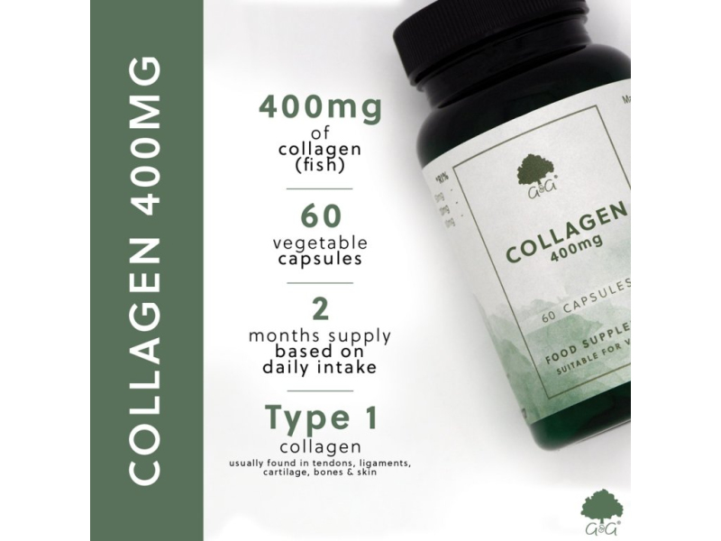 G&G Vitamins Kolagen 400 mg – hydrolyzovaný mořský kolagen typu I pro podporu zdraví pokožky, kloubů, kostí a šlach. Vysoká vstřebatelnost, rostlinné kapsle, dvouměsíční zásoba (60 kapslí).