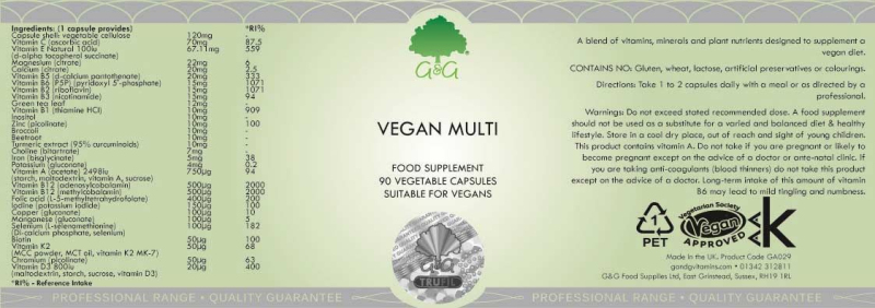 Chcete podpořit svou veganskou stravu? Vyzkoušejte Vegan Multi, speciální doplněk stravy od renomované britské firmy G&G Vitamins. Obsahuje směs vitam...