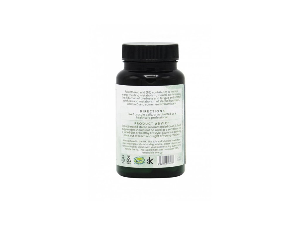 Vysoce účinný doplněk vitaminu B5. Obsahuje 500 mg vitaminu B5 (kyseliny pantotenové) v rostlinné kapsli.