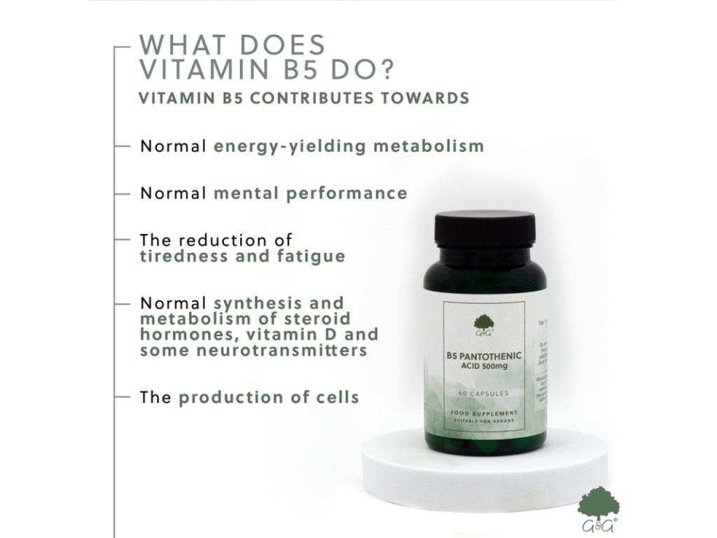 Kyselina pantotenová (vitamin B5) přispívá k normálnímu energetickému metabolismu, normální duševní výkonnosti. B5 také přispívá ke snížení míry únavy a vyčerpání a k normální syntéze a metabolismu steroidních hormonů, vitaminu D a některých neurotransmiterů.