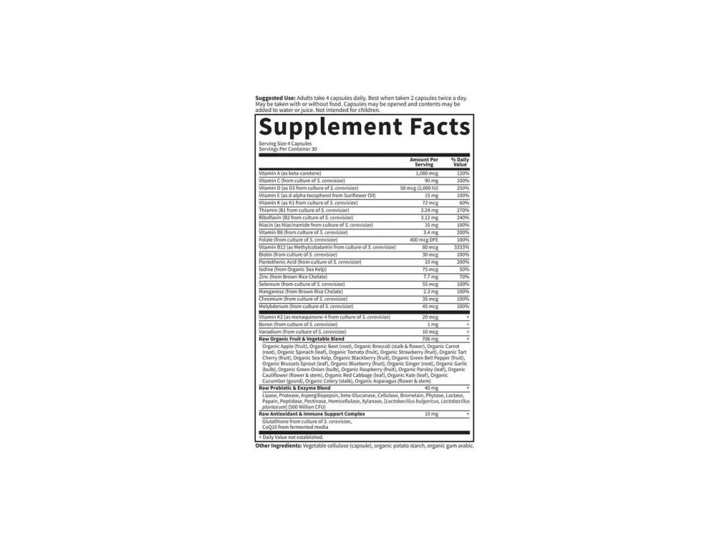 Organické jablko (plod), organická červená řepa (kořen), organická brokolice (stonek a květ), organická mrkev (kořen), organický špenát (list), organické rajče (plod), organické jahody (plod), organická třešeň (plod), organická mořská řasa, organické ostružiny (plod), organická zelená paprika (plod), organická růžičková kapusta (list), BIO borůvky (ovoce), BIO zázvor (kořen), BIO česnek (cibule), BIO zelená cibule (cibule), BIO maliny (ovoce), BIO petržel (list), BIO květák (květ a stonek), BIO červené zelí (list), BIO kapusta (list), BIO okurka (tykev), BIO celer (stonek), BIO chřest (květ a stonek) 706 mg +