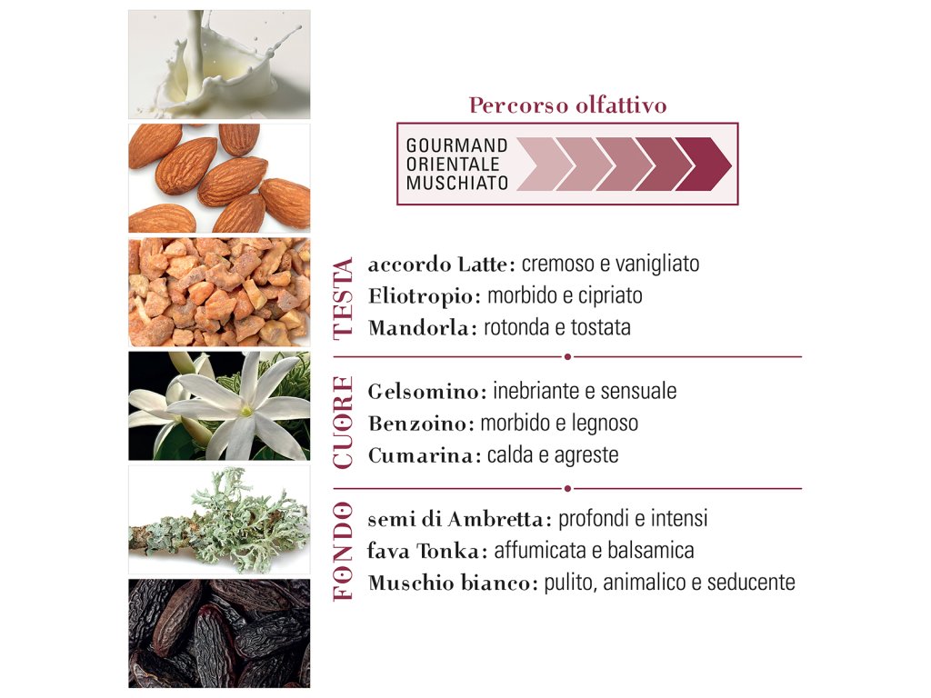 Vůně se otevírá krémově jemnými tóny s nádechem sladkých mandlí a heliotropu. Srdce přináší květinovou smyslnost jasmínu s hřejivou balzamickou hloubkou. Základ tvoří elegantní spojení ambretty, tonky a bílého pižma, které zanechává dlouhotrvající, hebkou a uklidňující stopu.