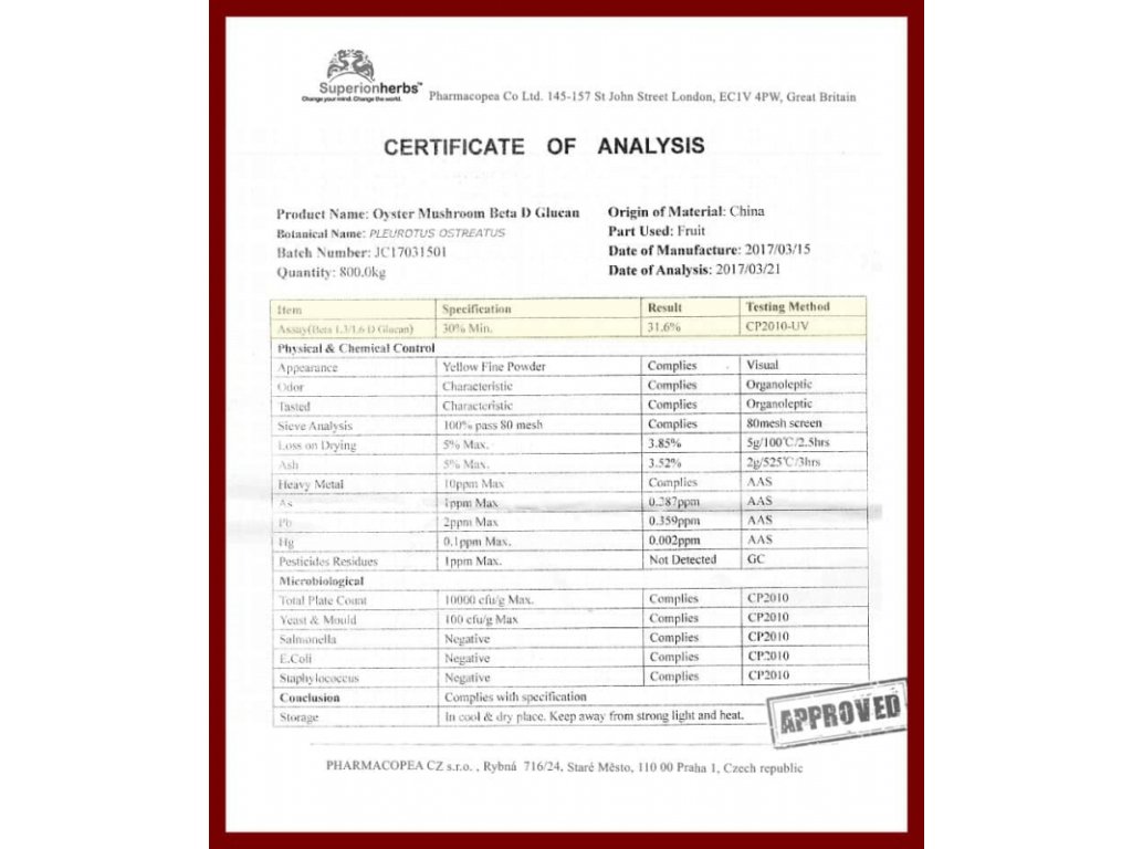 Tento produkt obsahuje kombinaci dvou typů standartizovaných extraktů z hlívy ústřičné doplněnou o extrakt z rakytníku řešetlákového o vysoké synergii a účinnosti. První extrakt z hlívy standardizovaný na obsah 50 % polysacharidů a druhý extrakt z hlívy standardizovaný na obsah 30 % betaglukanů.