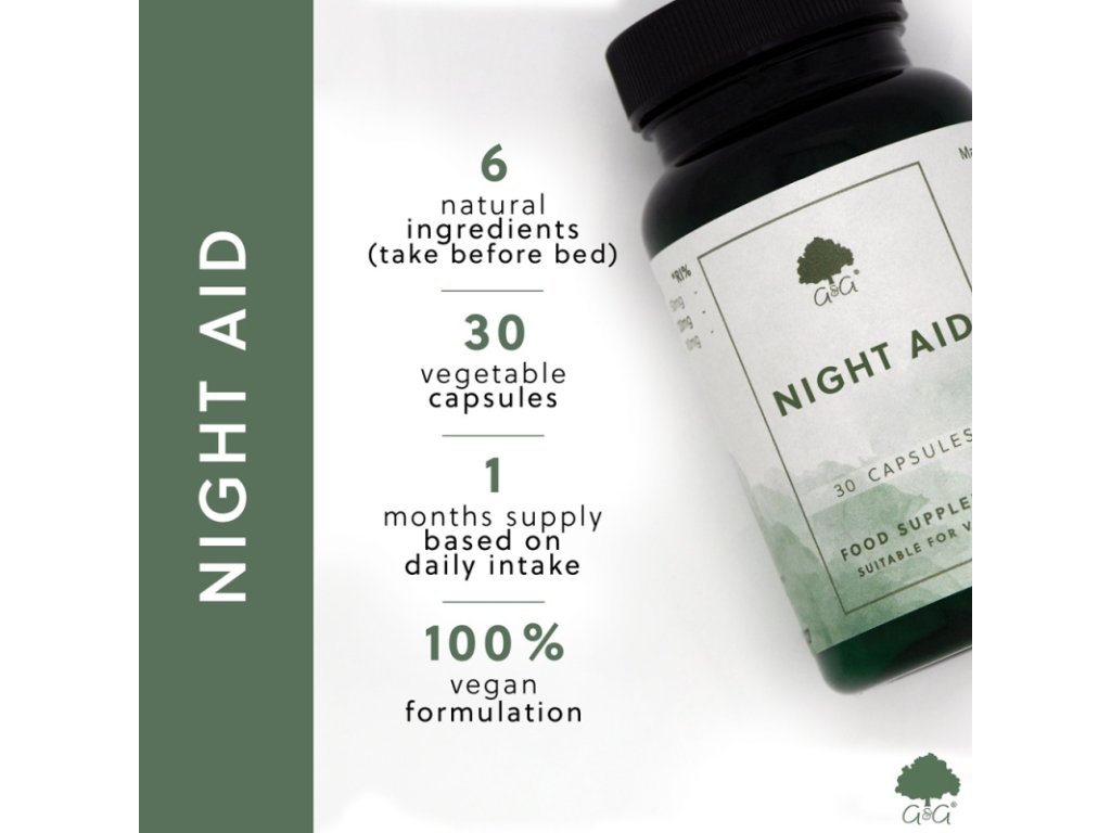 Night Aid je jedinstvena mješavina 5-HTP-a, magnezija, vitamina B6 i G&G noćne mješavine - mješavina 6 prirodnih sastojaka koja se može uzimati prije spavanja.