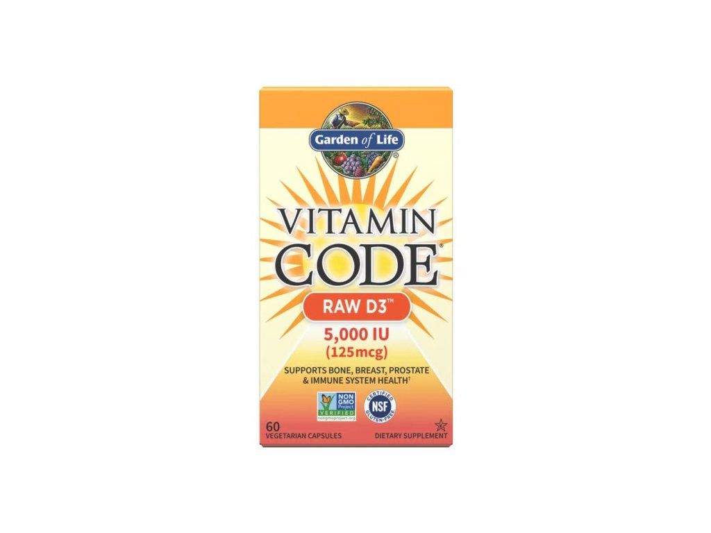 Garden of Life – Vitamin Code RAW D3, 5000 IU je vrhunski dodatak prehrani osmišljen za podršku zdravlju kostiju, imunitetu, tkivu dojki i prostate. Sadrži 125 mcg (5000 IU) vitamina D3 u njegovom biološki najaktivnijem obliku – kolekalciferolu – dobivenom iz kulture Saccharomyces cerevisiae. Zahvaljujući lipidnom nosaču iz napuknute Chlorelle, apsorpcija vitamina D3 je optimizirana čak i bez upotrebe sintetičkih tvari.