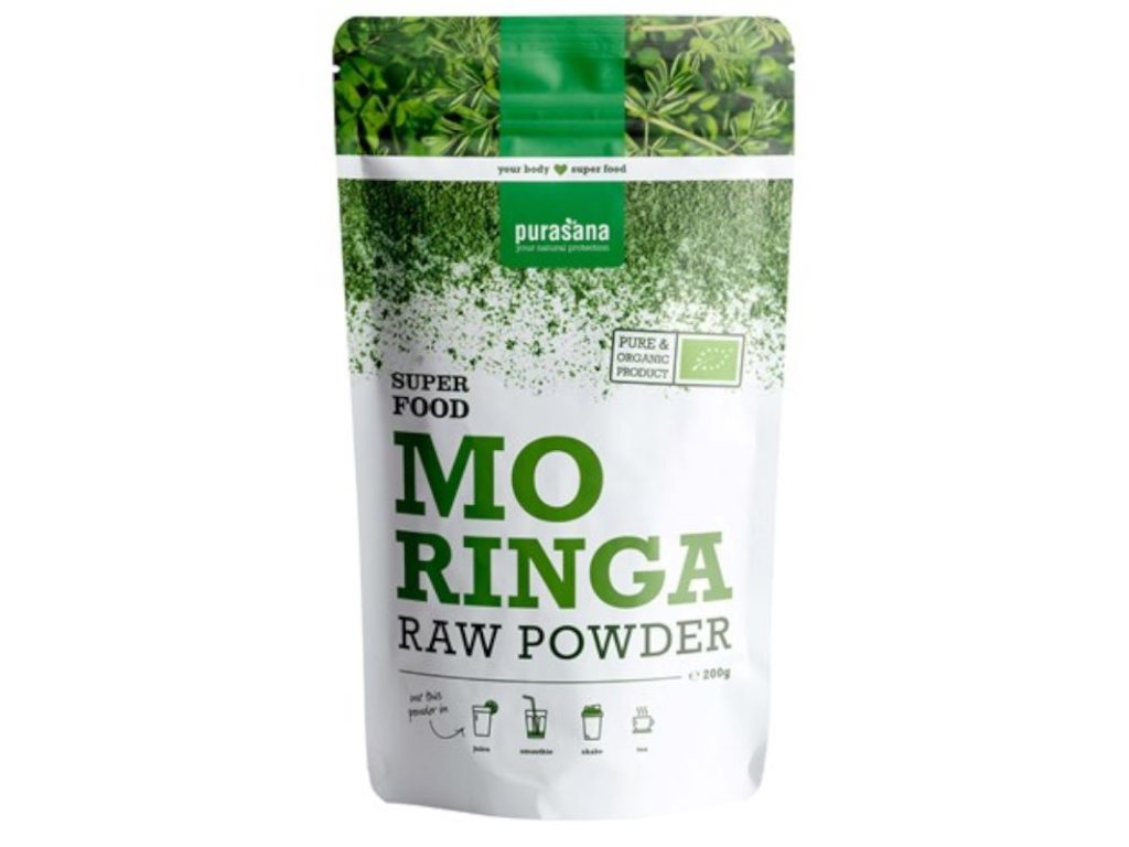 Sirovi prah moringe Moringa je poznata kao brzorastuće čudotvorno drvo porijeklom iz Indije i Afrike. Njezini listovi imaju veliku sposobnost zadržavanja hranjivih tvari i stoga su vrlo atraktivni izvori potrebnih mikronutrijenata. Sami listovi dio su uobičajene prehrane na afričkom kontinentu - koriste se za pripremu juha, salata i umaka ili se suše. Prašci se također koriste kao dodatak prehrani za djecu. Važan su izvor proteina, vitamina i minerala. Moringa se koristi i u narodnoj medicini. Proizvod je namijenjen svima koji su usredotočeni na:- Prirodni izvor važnih mikronutrijenata- Dodatak prehrani i elemente detoksikacijePakiranje: 200 g Upotreba: 1 g dnevno (otprilike 1 čajna žličica) preliti sa 70 - 100 ml vruće vode (80°C) ili pomiješati 2 g (otprilike 1 čajnu žličicu) s 300 ml soka, voćnog ili povrtnog koktela. Upozorenje: Nije prikladno za djecu, trudnice i dojilje. Pogodno za vegansku prehranu. Čuvati na suhom mjestu izvan dohvata djece. Čvrsto zatvoriti vrećicu nakon svake upotrebe.Nutritivne informacije:
