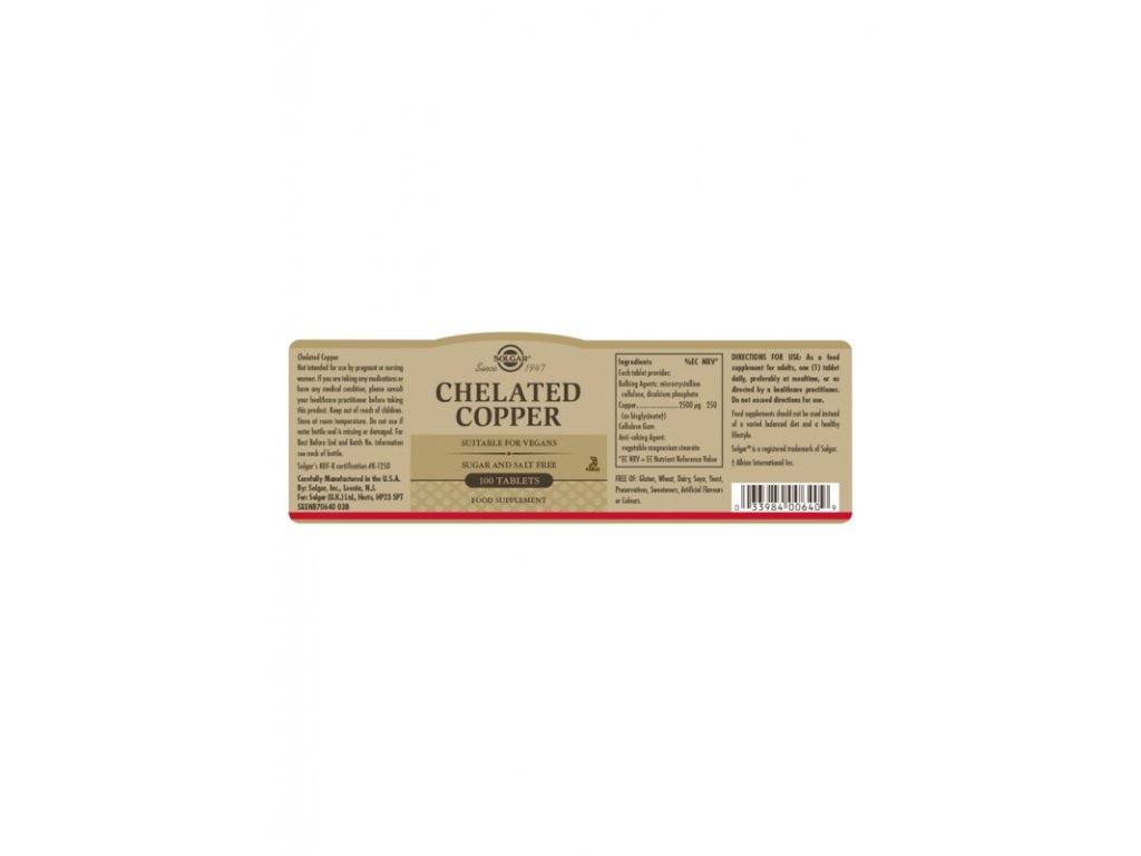 Bakar je važan mineral - doprinosi normalnoj funkciji živčanog i imunološkog sustava, a također doprinosi normalnom transportu željeza u tijelu. Dodatak prehrani.