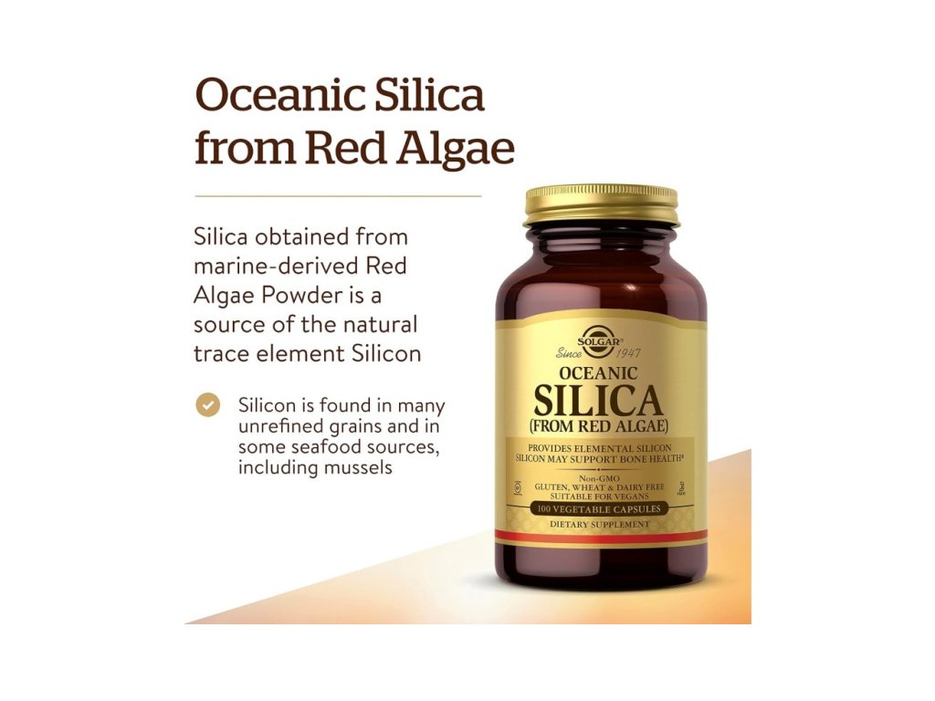 Solgar Oceanic Silica 25 mg je dodatak prehrani koji sadrži silicij dobiven iz crvene morske alge Lithothamnion corallioides. Silicij je važan element u tragovima koji se prirodno nalazi u nekim žitaricama i morskim plodovima. Povezan je s podrškom zdravlju kostiju, hrskavice, kože, kose i noktiju.