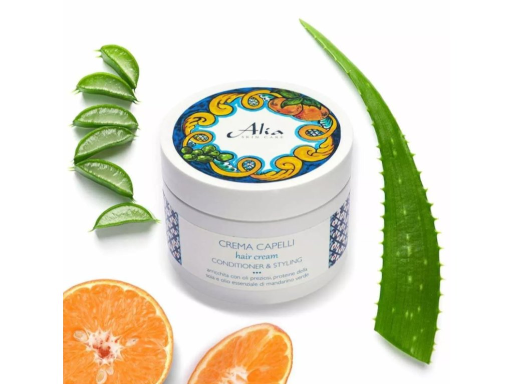 Az Alia skin care hajkrém gazdag, krémes textúrájú, aloe verát, extra szűz olívaolajat, búzacsírát és szójafehérjét tartalmaz. Ezek a bio összetevők revitalizáló és szerkezetátalakító hatást biztosítanak. A zöld mandarin illóolaj fényt és ragyogást kölcsönöz a hajnak anélkül, hogy elnehezítené azt.