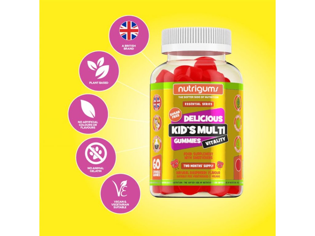 Természetes, ízletes és egészséges! A Nutrigums® Kids Multi Vitality finom, rágózselét kínál gyerekeknek természetes málnaízzel. 8 kulcsfontosságú bioaktív vitamint tartalmaz, amelyek támogatják az egészséges növekedést, az erős csontokat, az erős fogakat, az immunitást és a megfelelő agyműködést