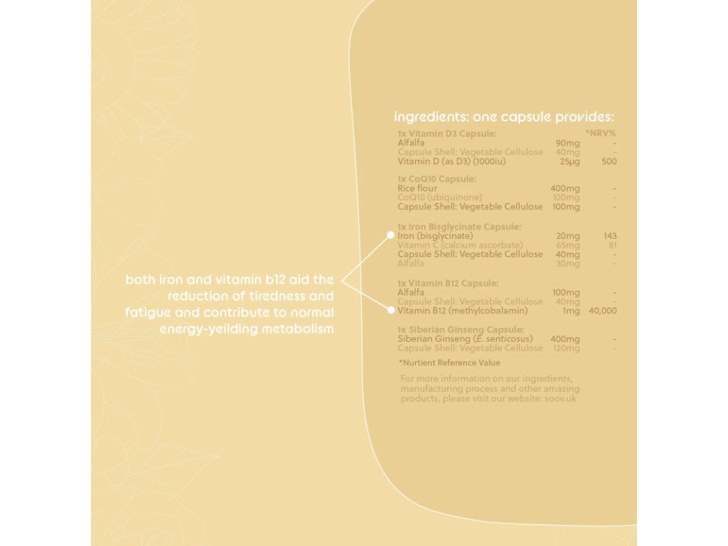 Kiválóan felszívódó vasat tartalmaz biszglicinát formájában, amely segít csökkenteni a fáradtságot, B12-vitamint metilkobalamin aktív formájában, D3-vitamint az immunitásért, Q10 koenzimet a sejtek energiatermeléséért, és szibériai ginzenget a stresszel szembeni ellenállásért és az általános vitalitásért.