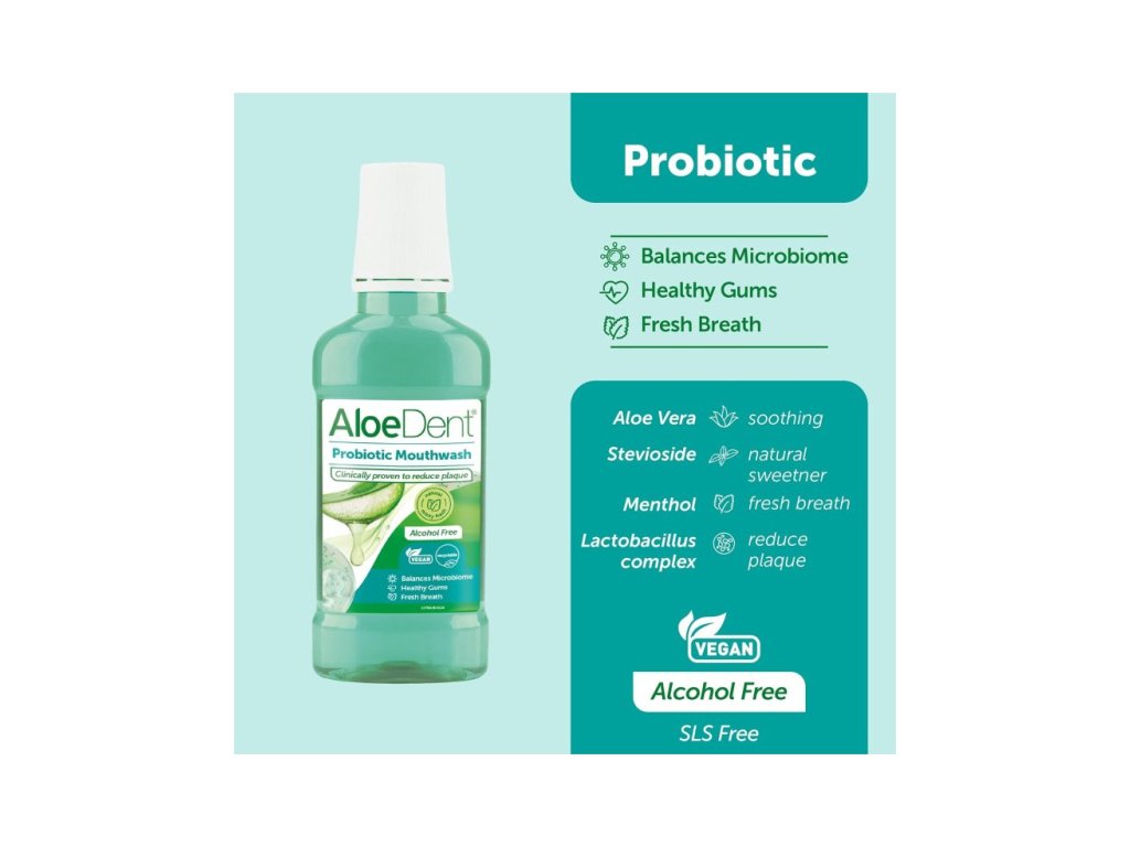 Il collutorio probiotico AloeDent è specificamente formulato con un complesso probiotico che aiuta a rinfrescare l'alito anche dopo l'uso.