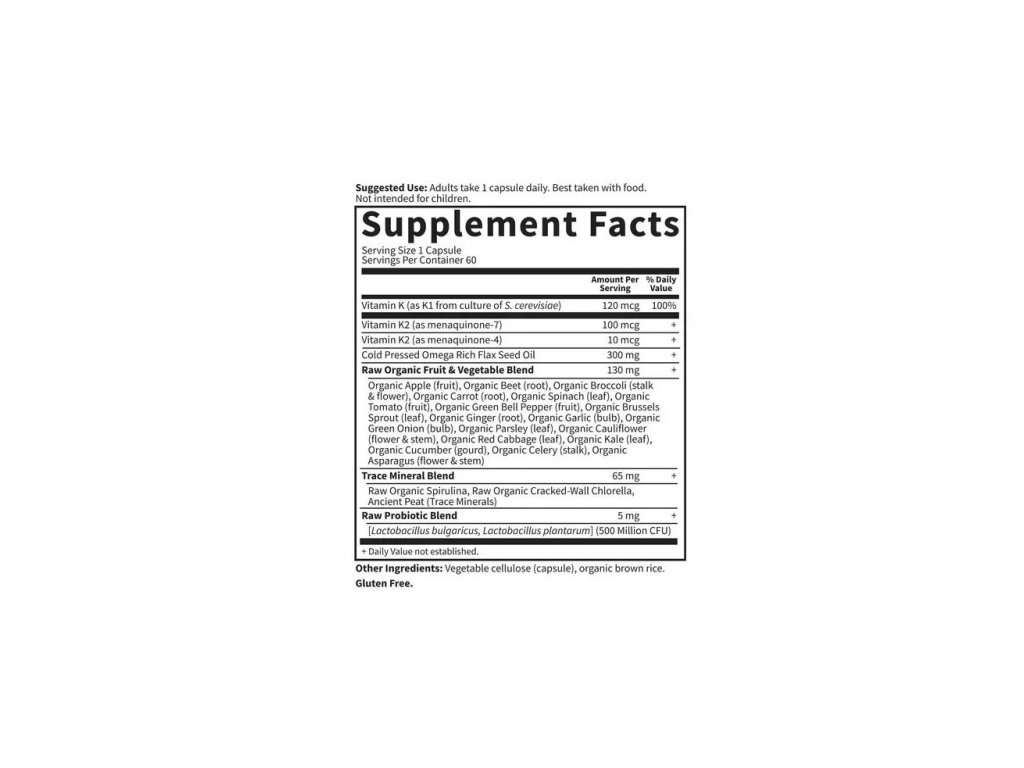Un complesso di tre forme di vitamina K con probiotici, verdure biologiche e ingredienti crudi per ossa, cuore e coagulazione del sangue sani. Integratore alimentare.