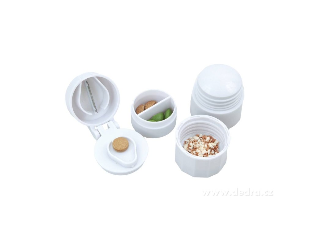 Pratico armadietto per medicinali 4 in 1: portapillole, tritatutto, contenitore per compresse e bicchiere, tutto in uno. Un aiuto ideale per l'uso quotidiano dei medicinali a casa e in viaggio.