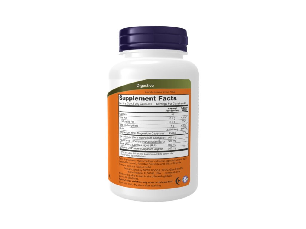 Lapacho, olio di origano, noce nera e acido caprilico per favorire una sana microflora intestinale.