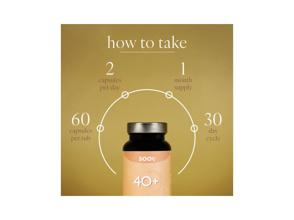 SOOV Women 40+ è un multivitaminico completo pensato per le donne nella seconda metà della loro vita. Contiene una combinazione bilanciata di vitamine del gruppo B, antiossidanti, adattogeni e minerali che aiutano a gestire il fabbisogno giornaliero di una donna moderna over 40. Grazie al contenuto di sostanze come ashwagandha, maca, curcuma, olivello spinoso e coenzima Q10, contribuisce alla vitalità generale, all'equilibrio ormonale e al benessere mentale. Supporta la salute di ossa, pelle, capelli e cuore e rafforza il sistema immunitario. Il prodotto è adatto per un uso quotidiano a lungo termine.