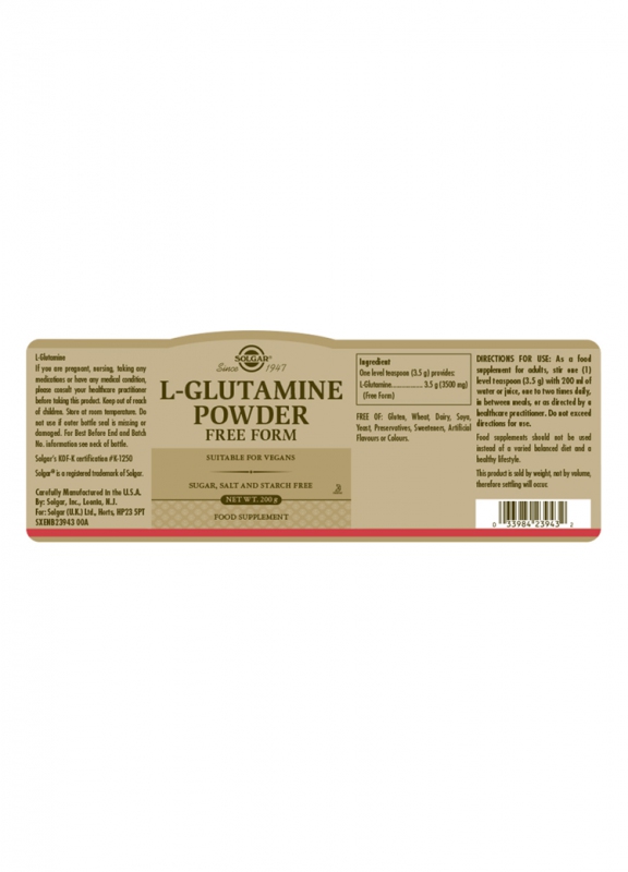 Doplněk stravy. L-Glutamin má roli v podpoře zdraví, wellness a sportovní výkonnosti. Solgar je hrdý na to, že představil L-glutamin prášek, který umožňuje snadné dávkování v závislosti na požadavcích.